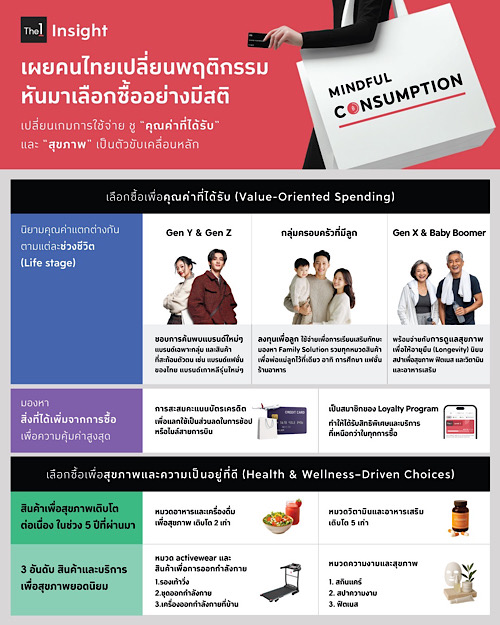 เมื่อพิจารณาทั้งสองแรงขับร่วมกันจะพบว่า Mindful Consumption ไม่ได้เป็นเพียงเทรนด์สั้น ๆ แต่เป็น การเปลี่ยนพฤติกรรมการใช้จ่ายของผู้บริโภคไทยอย่างแท้จริง แนวโน้มต่อจากนี้ คนไทยเลือกใช้จ่ายกับสินค้าและบริการที่ให้ “คุณค่าที่แท้จริงต่อชีวิต” ซึ่งต่างกันไปในแต่ละกลุ่ม พร้อมเพิ่มความสำคัญให้ “สุขภาพและสวัสดิภาพของตนเองและคนที่รัก” มากขึ้นอย่างไม่เคยเป็นมาก่อน และกำลังจะกลายเป็นปัจจัยหลักที่กำหนด loyalty และแรงขับของการใช้จ่ายในยุคถัดไป