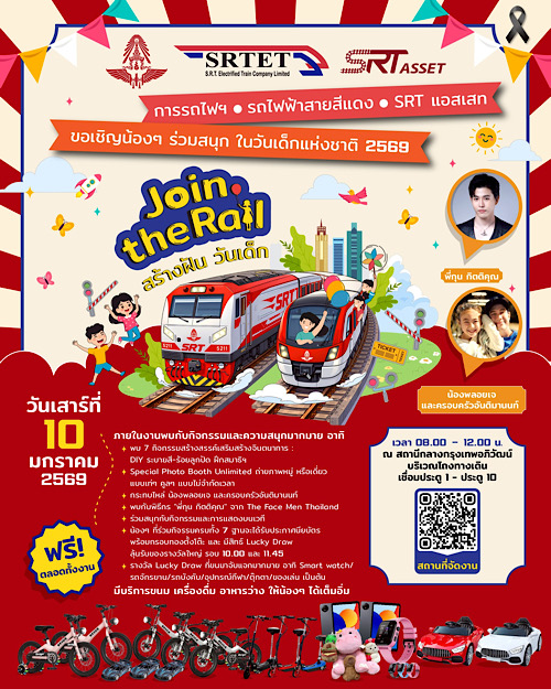นายสุเทพ พันธุ์เพ็ง กรรมการผู้อำนวยการใหญ่ บริษัท รถไฟฟ้า ร.ฟ.ท. จำกัด ผู้ให้บริการรถไฟฟ้าชานเมืองสายสีแดง เปิดเผยว่า รถไฟฟ้าชานเมืองสายสีแดง บูรณาการความร่วมมือกับ การรถไฟแห่งประเทศไทย และบริษัท เอสอาร์ที แอสเสท จำกัด จัดกิจกรรมสุดพิเศษ เนื่องในโอกาสวันเด็กแห่งชาติ ภายใต้แคมเปญ Join the Rail สร้างฝัน วันเด็ก ในวันเสาร์ที่ 10 มกราคม 2569 ตั้งแต่เวลา 08.00 – 12.00 น. ณ สถานีกลางกรุงเทพอภิวัฒน์ บริเวณโถงทางเดินเชื่อมประตู 1 – ประตู 10 โดยน้องๆทุกคนจะได้ร่วมสนุกกับกิจกรรมต่างๆภายในงาน ประกอบด้วย 7 ฐานกิจกรรมที่จะช่วยเสริมสร้างความรู้และจินตนาการ ซึ่งหากเข้าร่วมกิจกรรมครบทั้ง 7 ฐาน จะได้รับประกาศนียบัตรใส่กรอบทองสำหรับตั้งโต๊ะ พร้อมลุ้นรับของรางวัลใหญ่แบบจัดเต็ม อาทิ Smart Watch , รถจักรยาน , รถบังคับ และอุปกรณ์กีฬา เป็นต้น นอกจากนี้ยังมี Special Photo Booth ให้น้องๆได้ถ่ายภาพน่ารักๆแบบไม่จำกัด อีกทั้งยังได้กระทบไหล่กับน้องพลอยเจ และคุณเจจินตัย อันติมานนท์ รวมถึงพิธีกรรับเชิญสุดพิเศษ พี่กุน กิตติคุณ จาก The Face Men Thailand นอกจากนี้ภายในงานยังมีบริการขนม อาหารว่าง และเครื่องดื่มให้แก่น้องๆที่เข้าร่วมงานทุกคน โดยไม่มีค่าใช้จ่ายใดๆทั้งสิ้น ซึ่งบริษัทฯหวังเป็นอย่างยิ่งว่า กิจกรรมดังกล่าวจะสามารถสร้างความสุข ความสนุก และรอยยิ้มให้แก่น้องๆทุกคนในโอกาสวันเด็กแห่งชาติได้อย่างแน่นอน