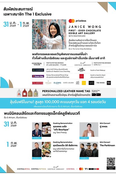 The 1 Exclusive จัดงานฉลองครบรอบ 5 ปี “The 1 Exclusive 5th Anniversary” เชิญสมาชิกร่วมงานตลอดช่วงสุดสัปดาห์ระหว่างวันที่ 31 มกราคม – 1 กุมภาพันธ์ 2569 ทั่วทั้งห้างเซ็นทรัล ชิดลม ผนึกพลัง Partnership Ecosystem ของกลุ่มเซ็นทรัลและพันธมิตร จัดเต็มกว่า 50 กิจกรรมสุดพิเศษ พบไฮไลต์กิจกรรมบนเวที Mini Concert จาก “ตู่ ภพธร” และ วง “The Parkinson”, Cooking Demonstration จาก Kaew Boutique และป๋อมแป๋ม-นิติ ชัยชิตาทร พร้อมร่วมกิจกรรม และรับของขวัญสุดพิเศษทั่วทั้งห้างเซ็นทรัล ชิดลม ครบทุกไลฟ์สไตล์เหนือระดับ เพียงแสดงสถานะสมาชิก The 1 Exclusive และลงทะเบียนผ่าน QR Code ภายในงาน สายบิวตี้ พบกับบริการพิเศษจาก Hermès Beauty, ELEMIS, CLARINS และอื่นๆ อีกมากมาย ที่แผนก Beauty Galerie ชั้น G สายแฟชั่น รับโปรโมชั่นและบริการพิเศษจากแบรนด์แฟชั่นระดับโลกที่ Luxe Galerie ชั้น 1 และ Central Embassy สายสปอร์ต รับบริการ Golf Fitting ปรับแต่งไม้กอล์ฟให้เหมาะกับผู้เล่นที่ Supersports ชั้น 3 สายไอที รับสายคล้องโทรศัพท์ Personalized เฉพาะคุณ จาก Power Buy ชั้น 4 พร้อมพบกับไฮไลต์สุดพิเศษ ประสบการณ์ครั้งแรกของโลก “First-Ever Chocolate Edible Art Gallery with Mastercard” รังสรรค์โดย Janice Wong เชฟระดับโลกเจ้าของรางวัล Asia’s Best Pastry Chef สองปีซ้อน ที่ The Corner Shop ชั้น G