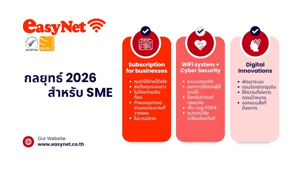 10 กุมภาพันธ์ 2569, กรุงเทพฯ – บริษัท อีซี่ เน็ต (ไทยแลนด์) จำกัด ผู้เชี่ยวชาญการด้านวางระบบ Network และ ไอที โซลูชันเต็มรูปแบบอย่างครบวงจรโดยได้การรับรองจาก ISO9001 : 2015 และ ISO27001 นำโดย นายโกวิท ธารีรัตนาวิบูลย์ ประธานเจ้าหน้าที่บริหาร พร้อมด้วยนางวาณา ธารีรัตนาวิบูลย์ ประธานเจ้าหน้าที่ฝ่ายการตลาด และนายพงศภัค ธารีรัตนาวิบูลย์ ประธานเจ้าหน้าที่ฝ่ายปฏิบัติการ จัดงานแถลงข่าว “เปิดกลยุทธ์ EasyNet 2026: เพื่อนคู่คิดทางเทคโนโลยีของ SME” มุ่งเป้าขับเคลื่อนเศรษฐกิจดิจิทัลของไทยผ่านโมเดล “เช่าระบบ WiFi พร้อมอุปกรณ์แบบครบวงจร” (WiFi as a Service) เพื่อทลายขีดจำกัดด้านงบประมาณและเพิ่มขีดความสามารถในการแข่งขันให้กับผู้ประกอบการทุกระดับ