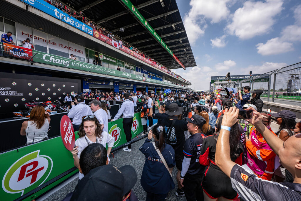 การแข่งขันรถจักรยานยนต์ทางเรียบชิงแชมป์โลก “โมโตจีพี” ประเดิมสนามแรกของฤดูกาล 2026 ภายใต้ชื่อรายการ “PT Grand Prix of Thailand 2026” ที่ สนามช้าง อินเตอร์เนชั่นแนล เซอร์กิต จ.บุรีรัมย์ บรรยากาศเต็มไปด้วยความคึกคักอย่างมาก แฟนความเร็วทั้งชาวไทยและต่างชาติจากทั่วทุกมุมโลกต่างหลั่งไหลเข้าสู่สนามอย่างเนืองแน่น เพื่อร่วมเป็นส่วนหนึ่งของเทศกาลมอเตอร์สปอร์ตที่ยิ่งใหญ่ที่สุดในโลก ท่ามกลางความตื่นตาตื่นใจกับกิจกรรมที่จัดเต็มครบเครื่องสำหรับคนรักความเร็วตลอด 3 วันเต็ม